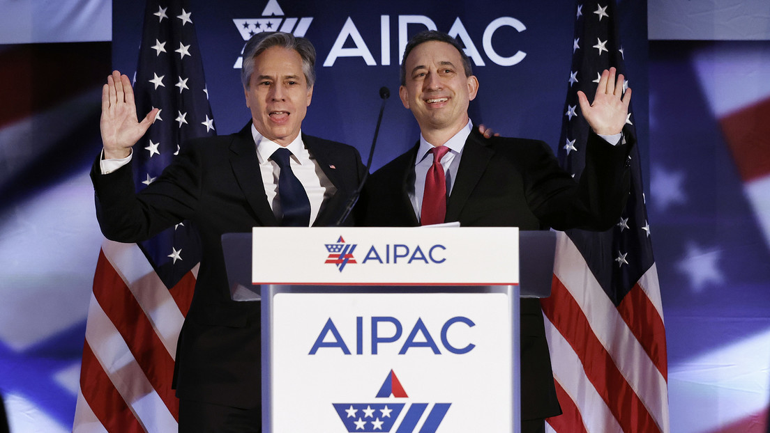 erschienen am 6. August 2025 auf RT de Bild: Der damalige US-Außenminister Antony Blinken (l.) wird am 05. Juni 2023 vom Präsidenten des American Israel Public Affairs Committee (AIPAC), Michael …