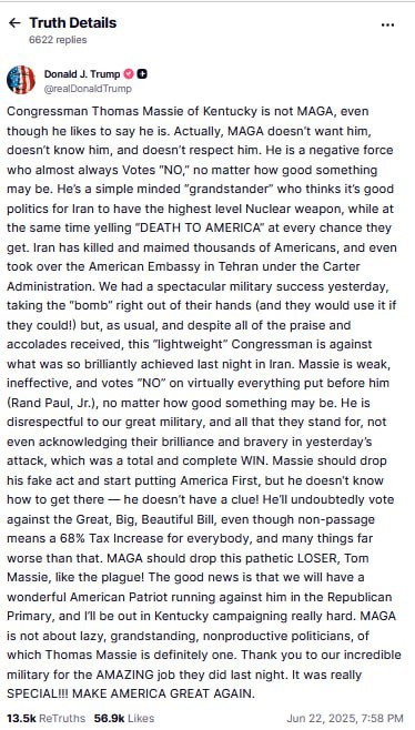 „Congressman Thomas Massie of Kentucky is not MAGA, even though he likes to say he is. Actually, MAGA doesn’t want him, doesn’t know him, and doesn’t respect him. He is a negative force who almost always Votes “NO,” no matter how good something may be. He’s a simple minded “grandstander” who thinks it’s good politics for Iran to have the highest level Nuclear weapon, while at the same time yelling “DEATH TO AMERICA” at every chance they get. Iran has killed and maimed thousands of Americans, and even took over the American Embassy in Tehran under the Carter Administration. We had a spectacular military success yesterday, taking the “bomb” right out of their hands (and they would use it if they could!) but, as usual, and despite all of the praise and accolades received, this “lightweight” Congressman is against what was so brilliantly achieved last night in Iran. Massie is weak, ineffective, and votes “NO” on virtually everything put before him (Rand Paul, Jr.), no matter how good something may be. He is disrespectful to our great military, and all that they stand for, not even acknowledging their brilliance and bravery in yesterday’s attack, which was a total and complete WIN. Massie should drop his fake act and start putting America First, but he doesn’t know how to get there — he doesn’t have a clue! He’ll undoubtedly vote against the Great, Big, Beautiful Bill, even though non-passage means a 68% Tax Increase for everybody, and many things far worse than that. MAGA should drop this pathetic LOSER, Tom Massie, like the plague! The good news is that we will have a wonderful American Patriot running against him in the Republican Primary, and I’ll be out in Kentucky campaigning really hard. MAGA is not about lazy, grandstanding, nonproductive politicians, of which Thomas Massie is definitely one. Thank you to our incredible military for the AMAZING job they did last night. It was really SPECIAL!!! MAKE AMERICA GREAT AGAIN.“