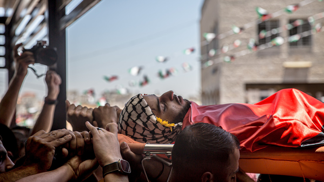erschienen am 18. Juli 2025 auf RT de Bild: Der Leichnam von Sayfollah Musallet (20) wird während seiner Beerdigungszeremonie in Al-Mazra’a ash-Sharqiya getragen, zwei Tage nachdem er Berichten zufolge von …