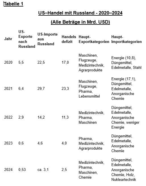 Anhand von Daten der letzten fünf Jahre (Anfang 2020 bis 2024) bieten die nachfolgenden Kapitel einen Überblick über die Dynamik des US-russischen Handels, gefolgt von einer Analyse der möglichen Auswirkungen der nächsten Sanktionen und Zölle „aus der Hölle“. Zuletzt wird untersucht, welche Substitutionsmöglichkeiten die USA bzw. Russland bei einer völligen Einstellung des Warenaustauschs zwischen den beiden Ländern hätten und welche Auswirkungen auf die Preisentwicklungen in den jeweils heimischen Märkten zu erwarten wären. Dazu schon ein Vorabhinweis: Trump würde sich mit der Umsetzung seiner Drohung wirtschaftlich ins eigene Knie schießen, während Russland seine wenigen noch verbliebenen US-Importe problemlos aus nicht westlichen Ländern beziehen könnte.