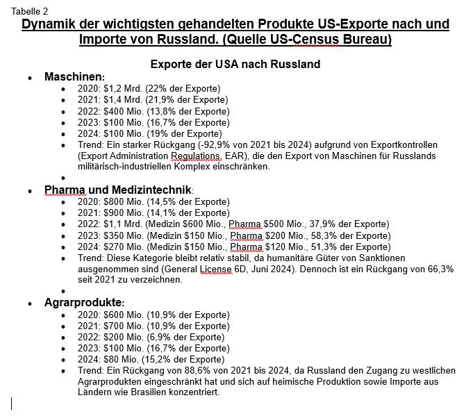 Was die angebliche russische Abhängigkeit von US-Importen betrifft, so ist sie laut einstimmiger Meinung aller Experten gleich null. Das kann man allein schon am Warenwert von 526,1 Millionen (nicht Milliarden) Dollar erkennen, die im vergangenen Jahr aus den USA importiert wurden. 2024 importierte Russland aus den USA Medizintechnik für 150 Millionen Dollar, Pharmaprodukte für 120 Millionen Dollar, Maschinen für 100 Millionen Dollar, Lebensmittel/Chemikalien für 80 Millionen Dollar). Das macht nur einen Bruchteil der gesamten russischen Importe von 289 Milliarden Dollar im Jahr 2023 aus.